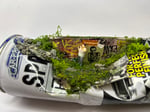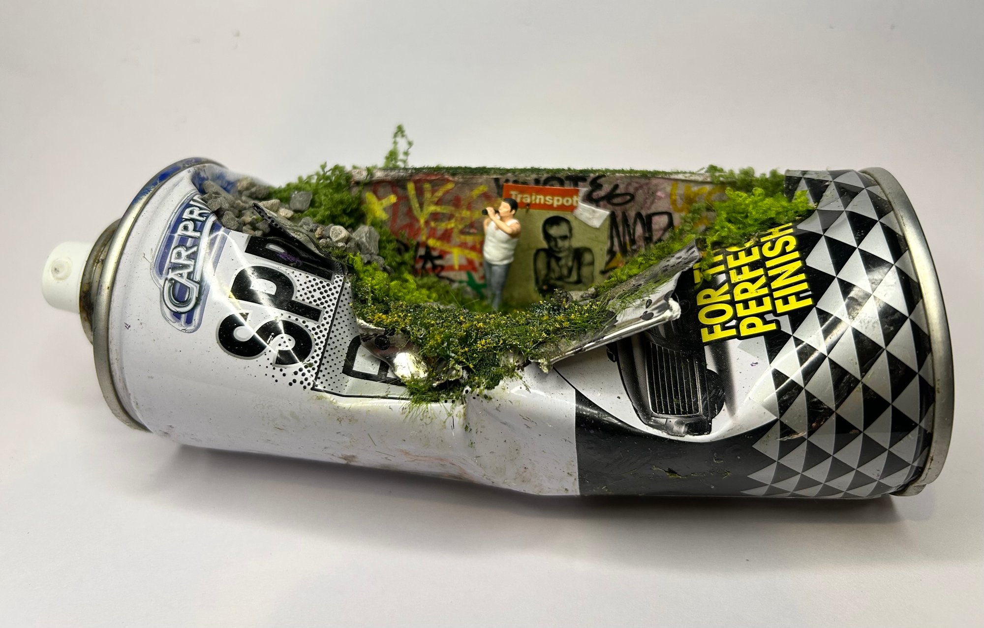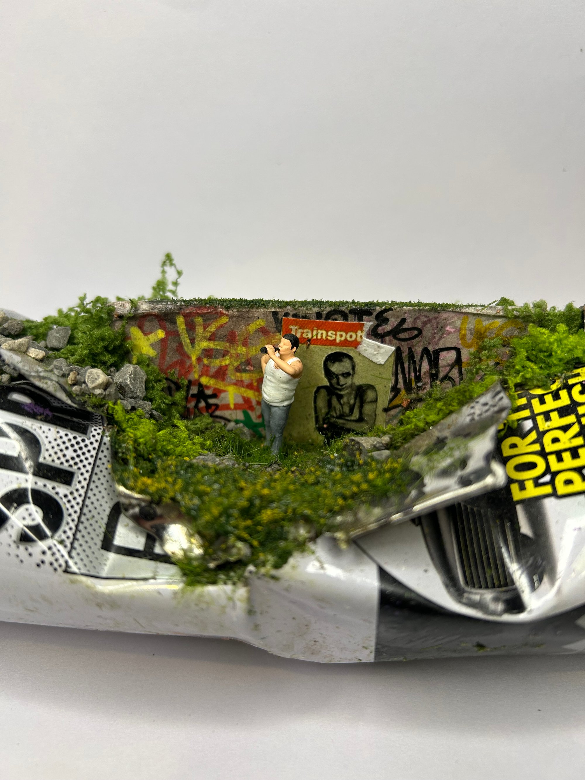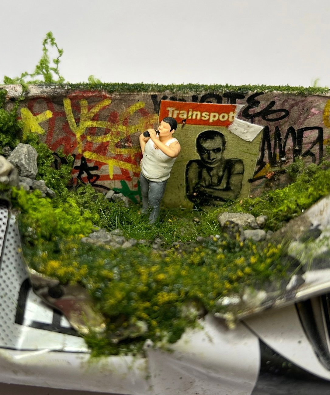 Graffiti wall with a Trainspotting poster and a heavy-set man drinking a beer. A nod to 90s cinema and everyday street life