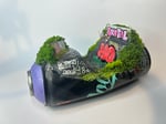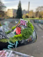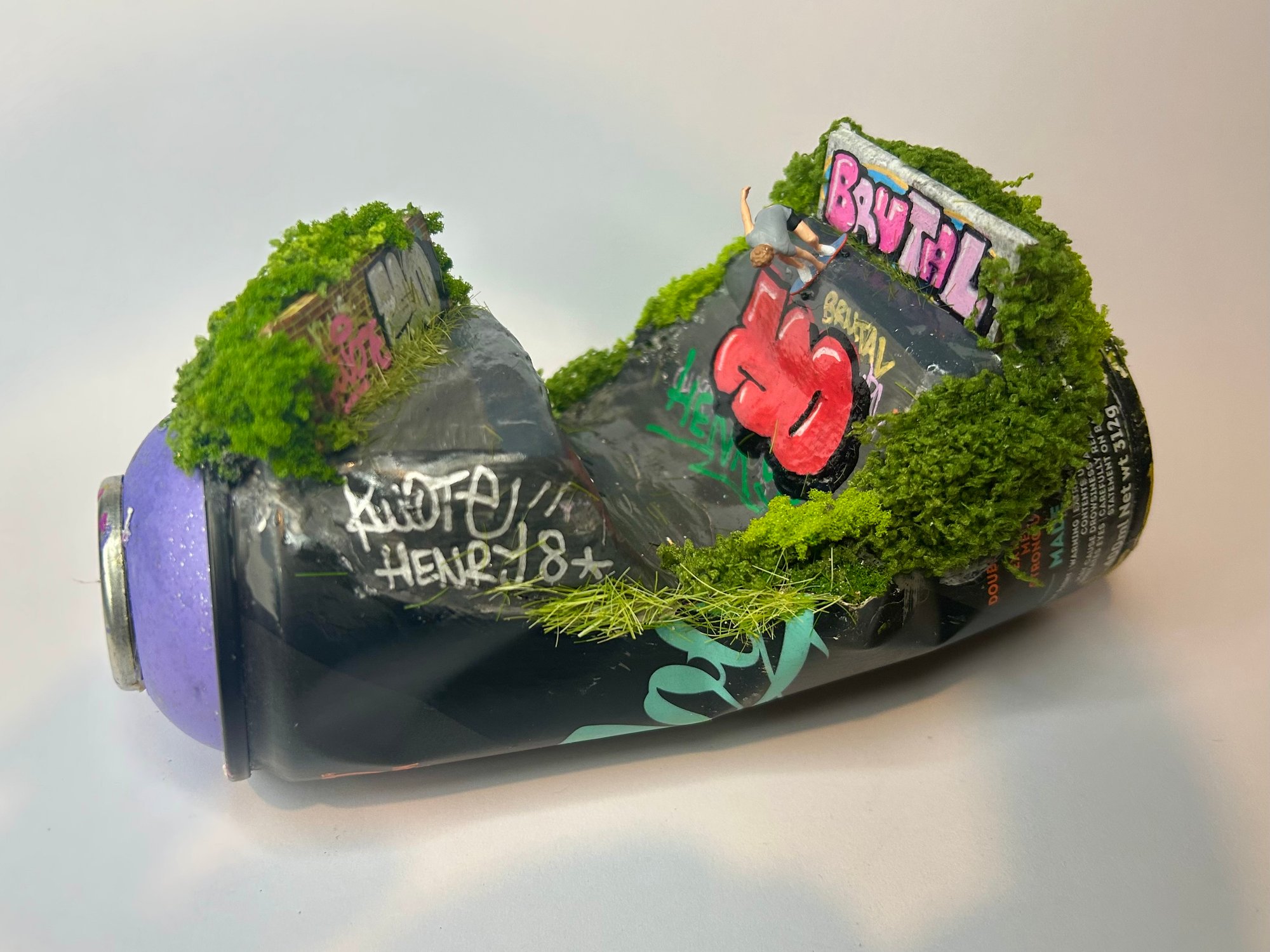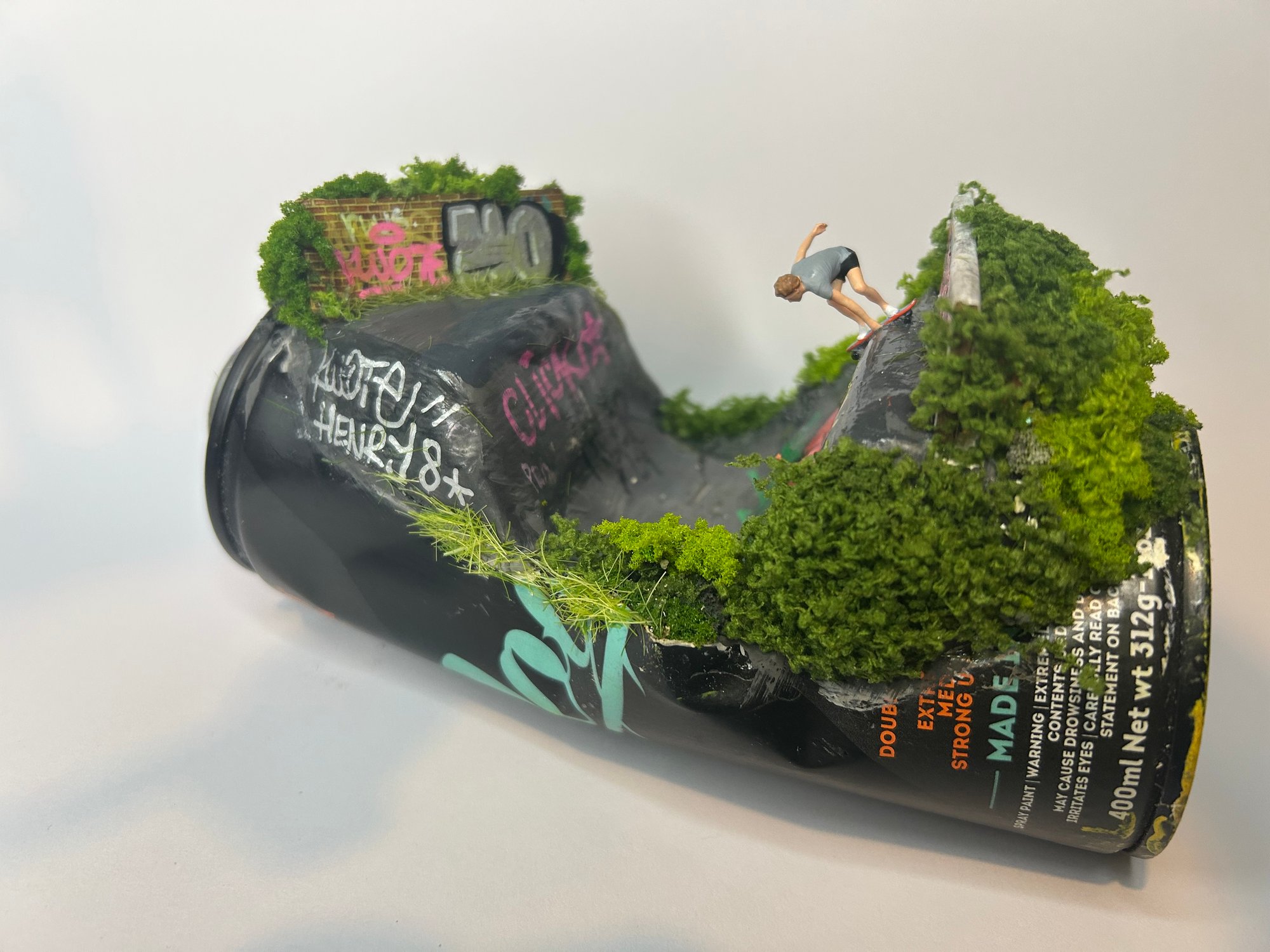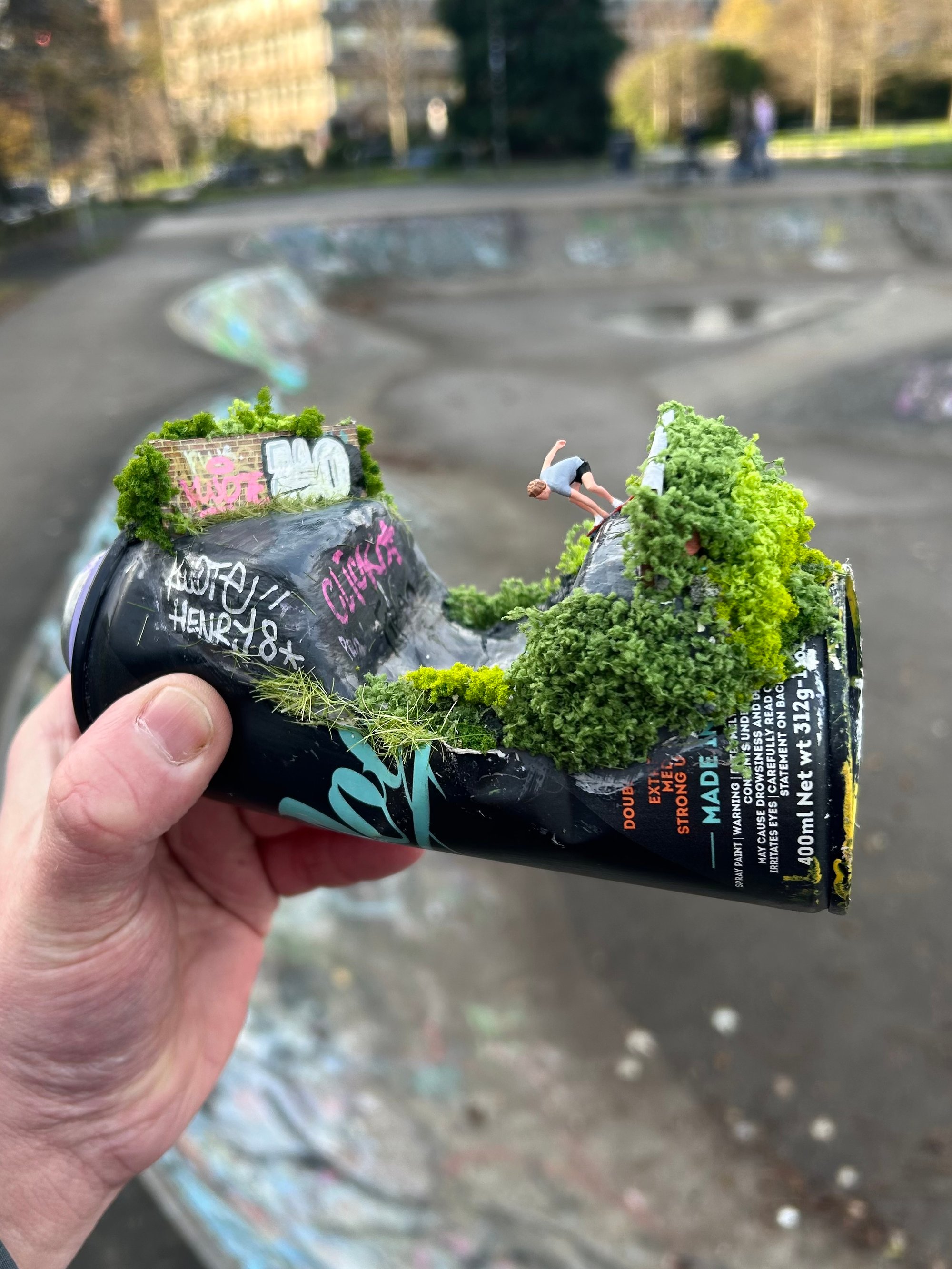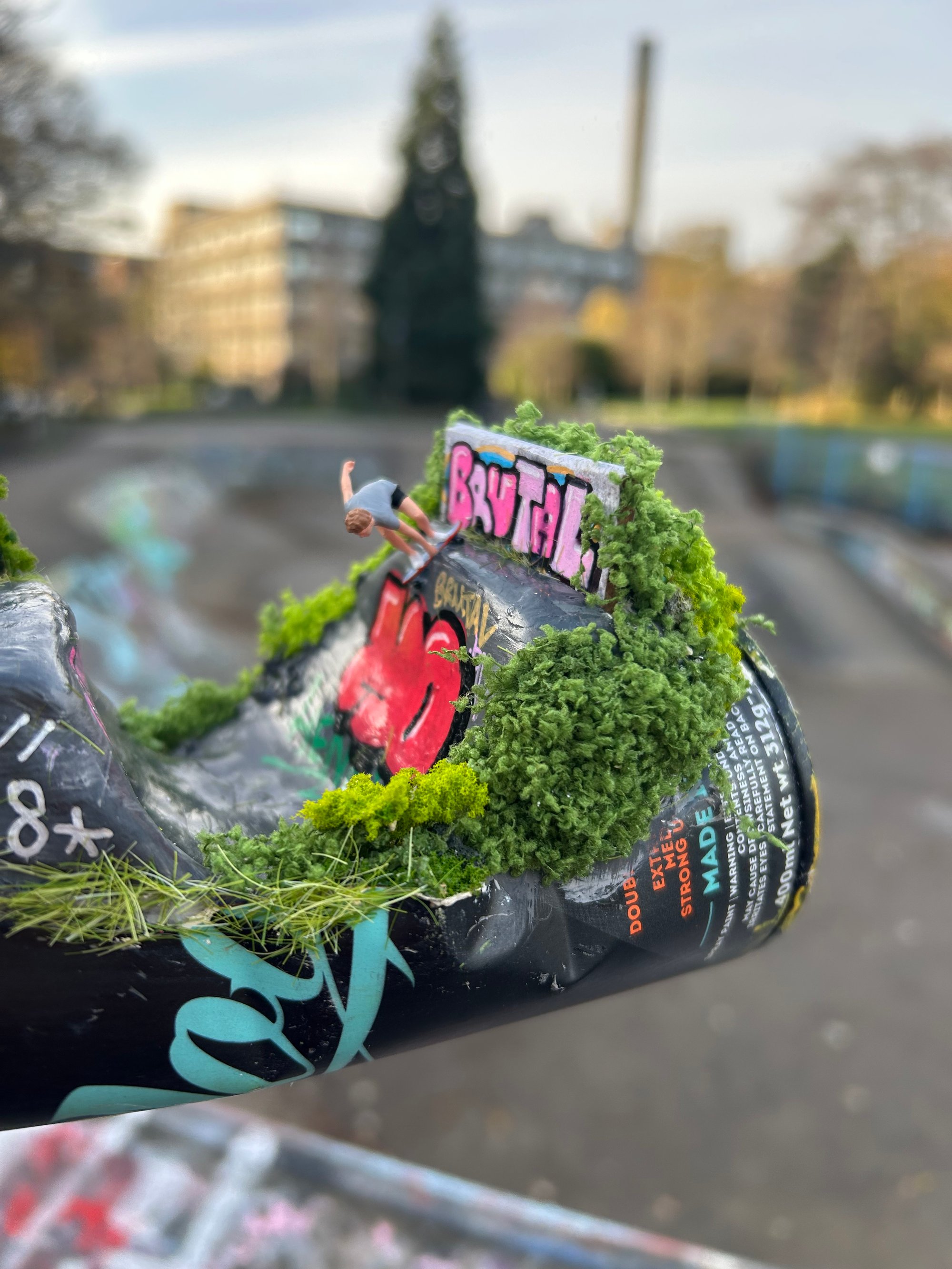 A battered DIY halfpipe built inside a crushed spray can, a tiny skate spot with years of rough landings behind it.
