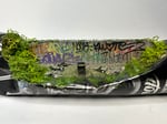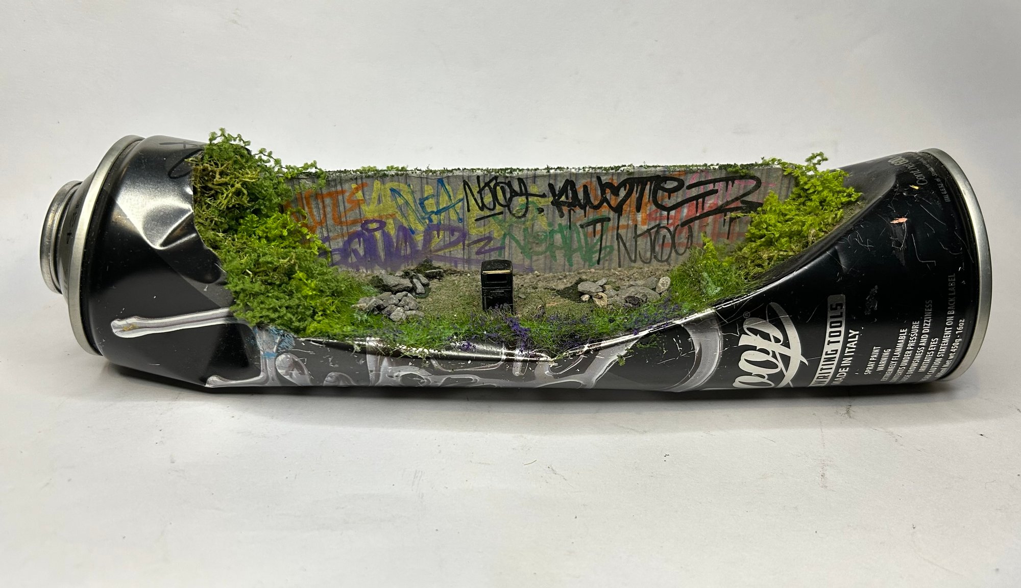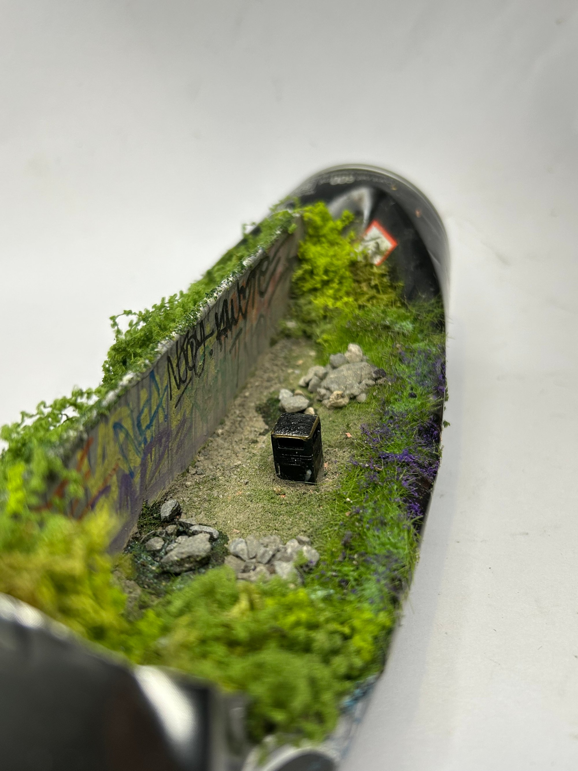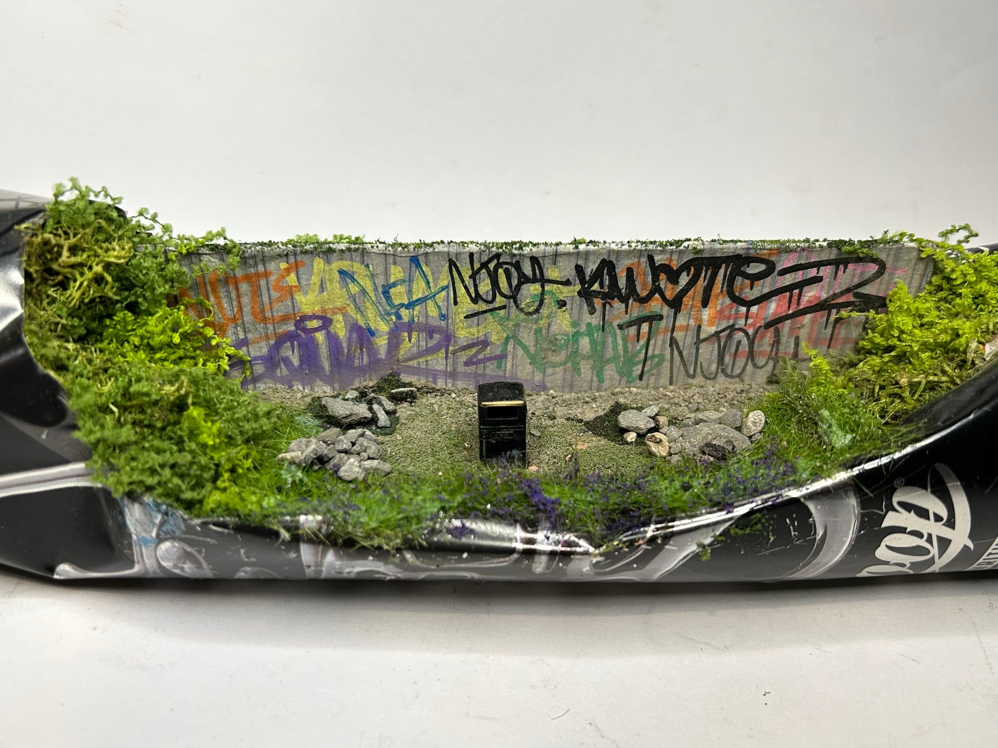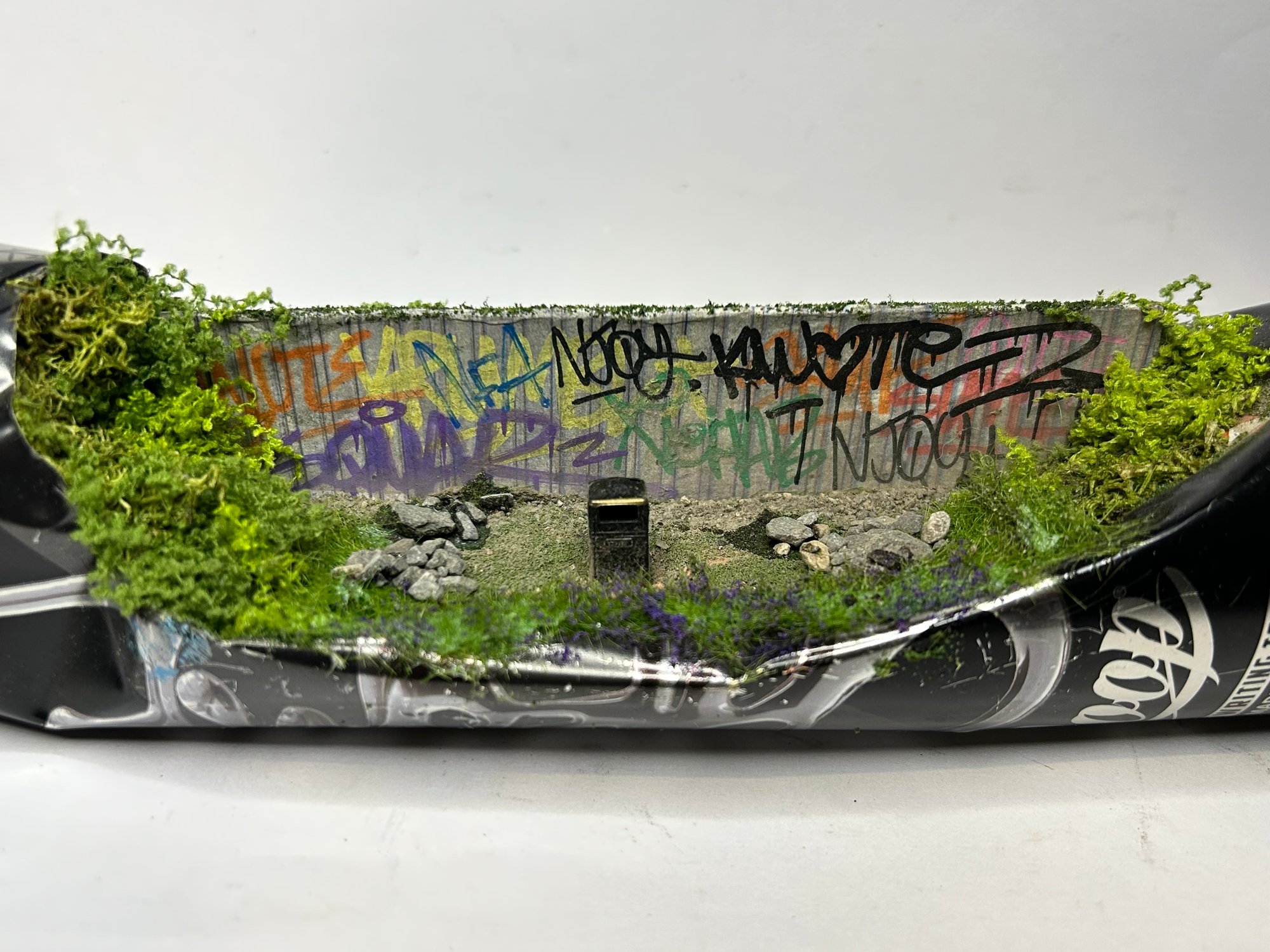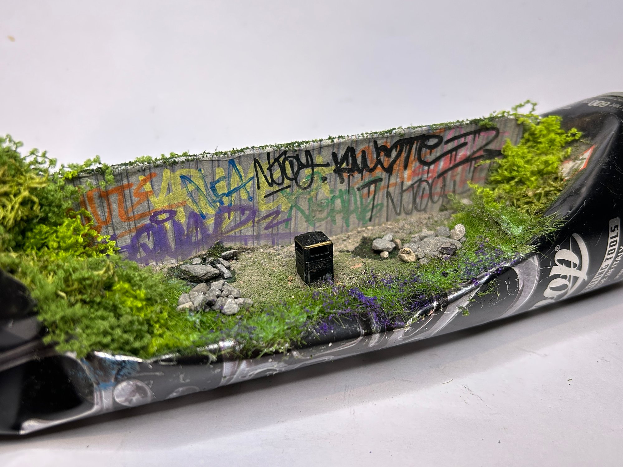 A spray can diorama of a dusty alleyway, complete with graffiti walls, scattered stones, and a lonely black litter bin.