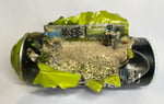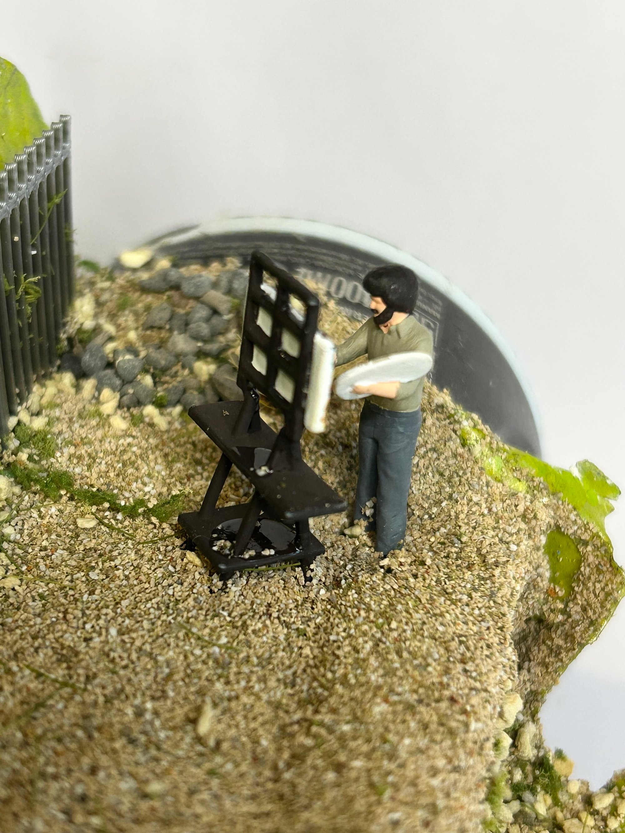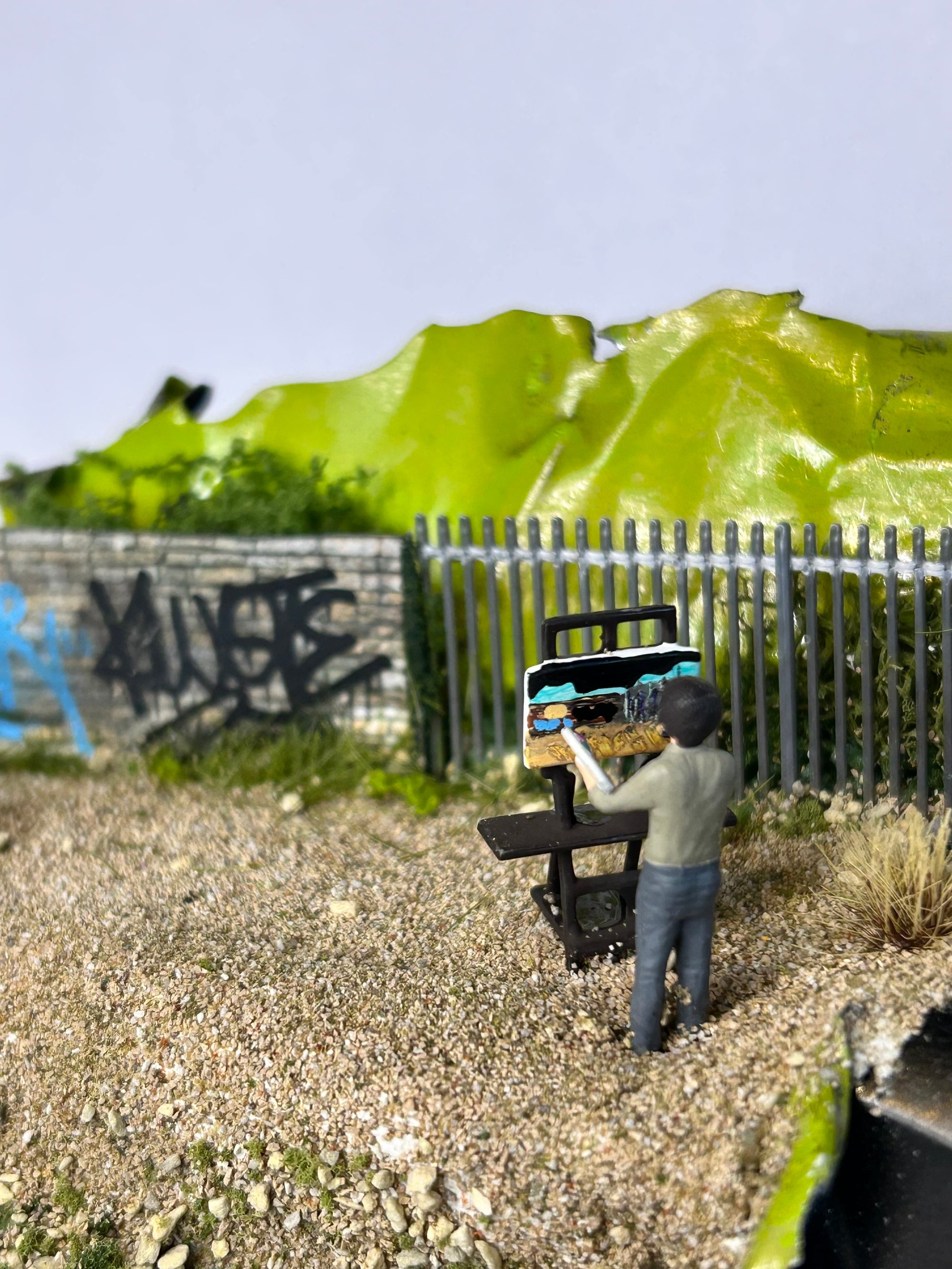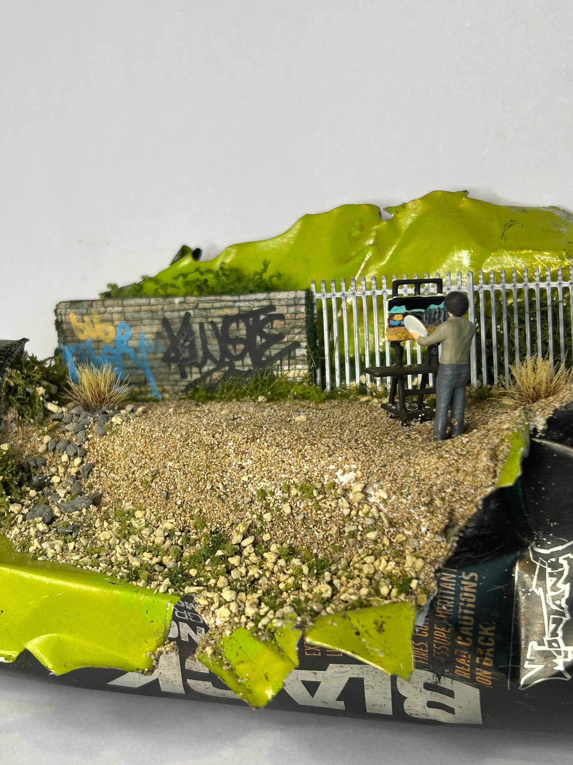 A crushed spray can turned into a tiny world — complete with graffiti walls, a triple-prong fence, and a miniature Bob Ross adding his own ‘happy little’ touch. One-of-a-kind street art diorama.