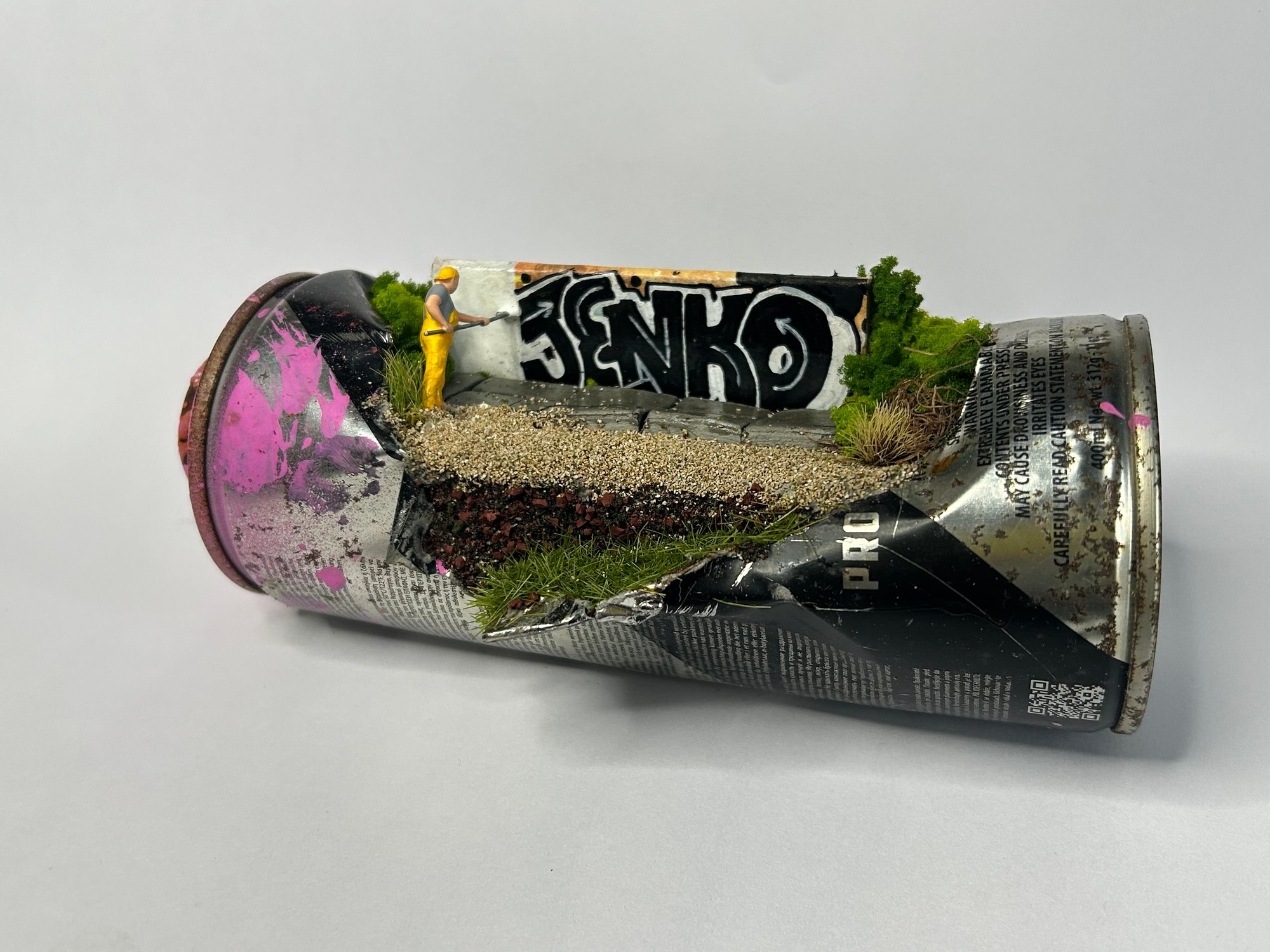 A man whitewashing a wall that’s been graffiti’d by Jenko.