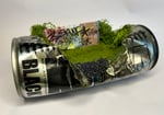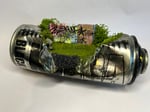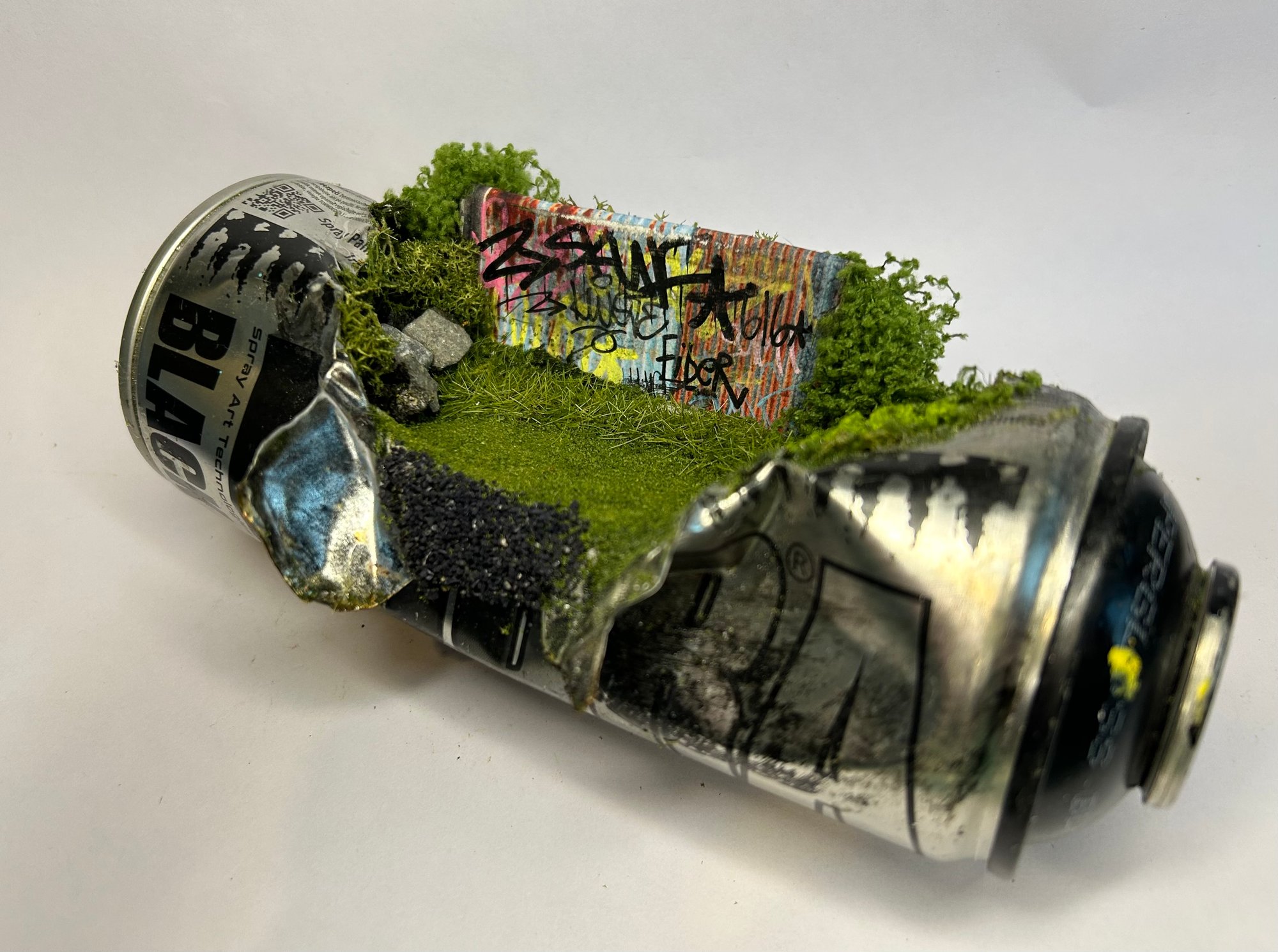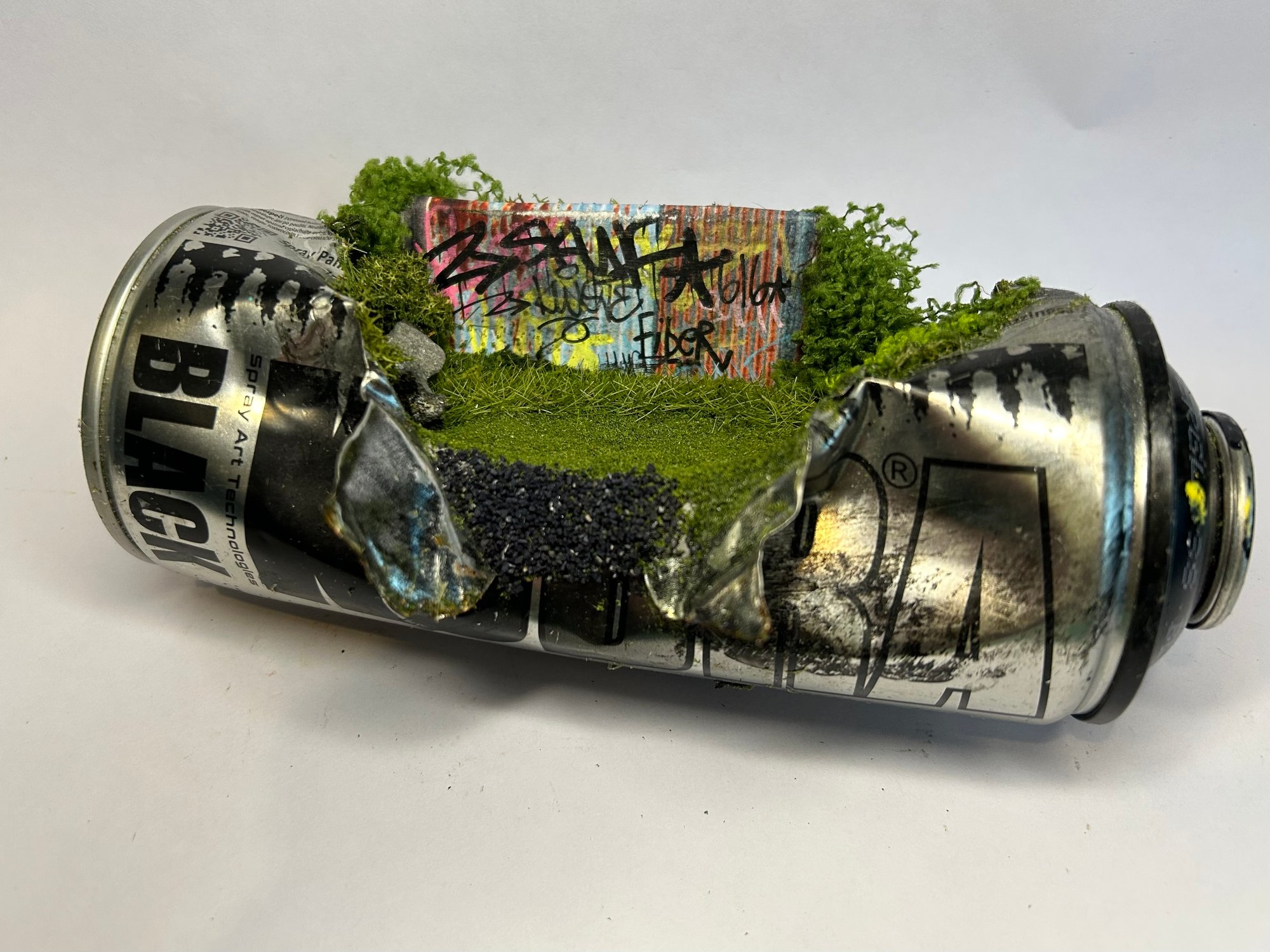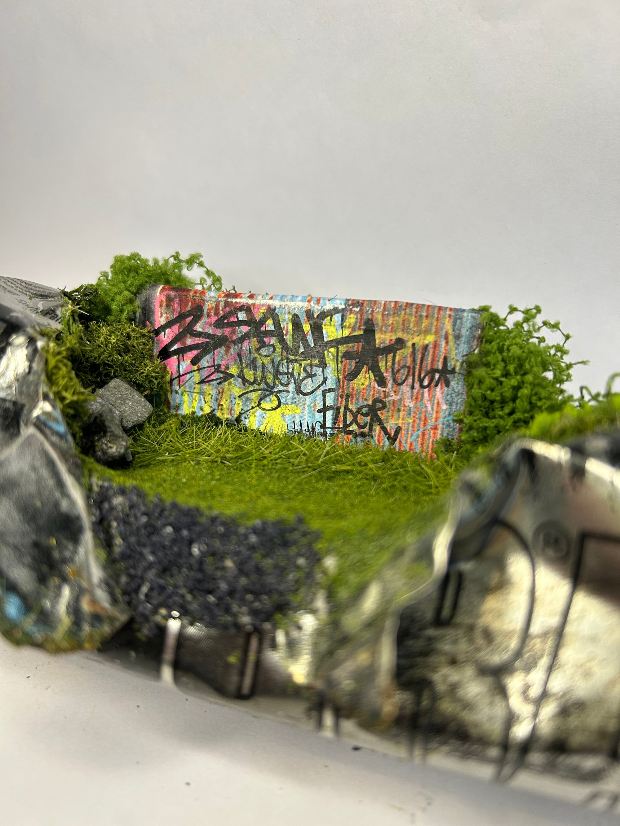 Rocks and grass against a corrugated fence covered in graffiti Tucked away in a Kobra spray paint can