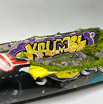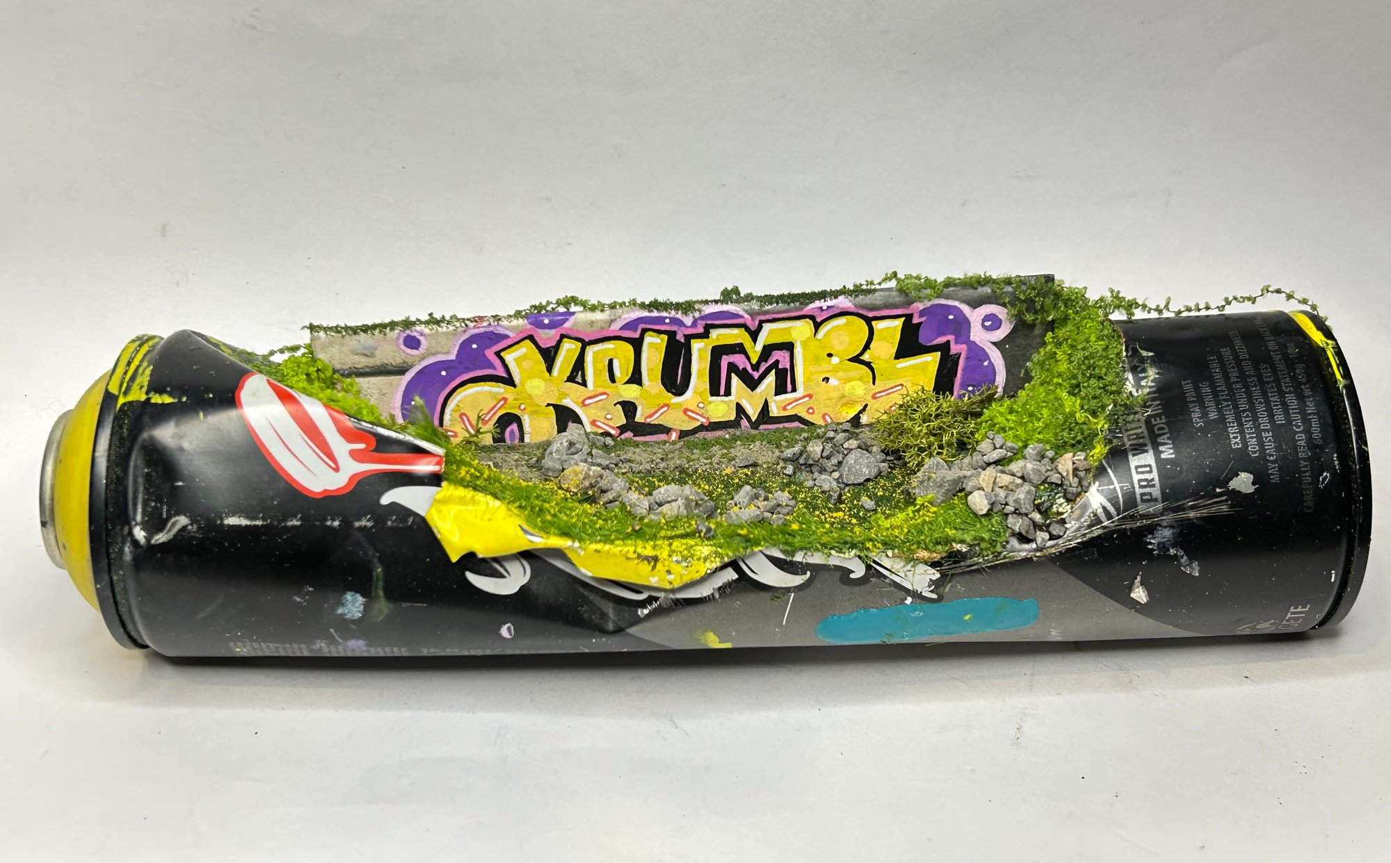 A 600ml yellow spray can diorama with a grassy scene, scattered stones, and a bold yellow Krumbl graffiti wall.
