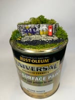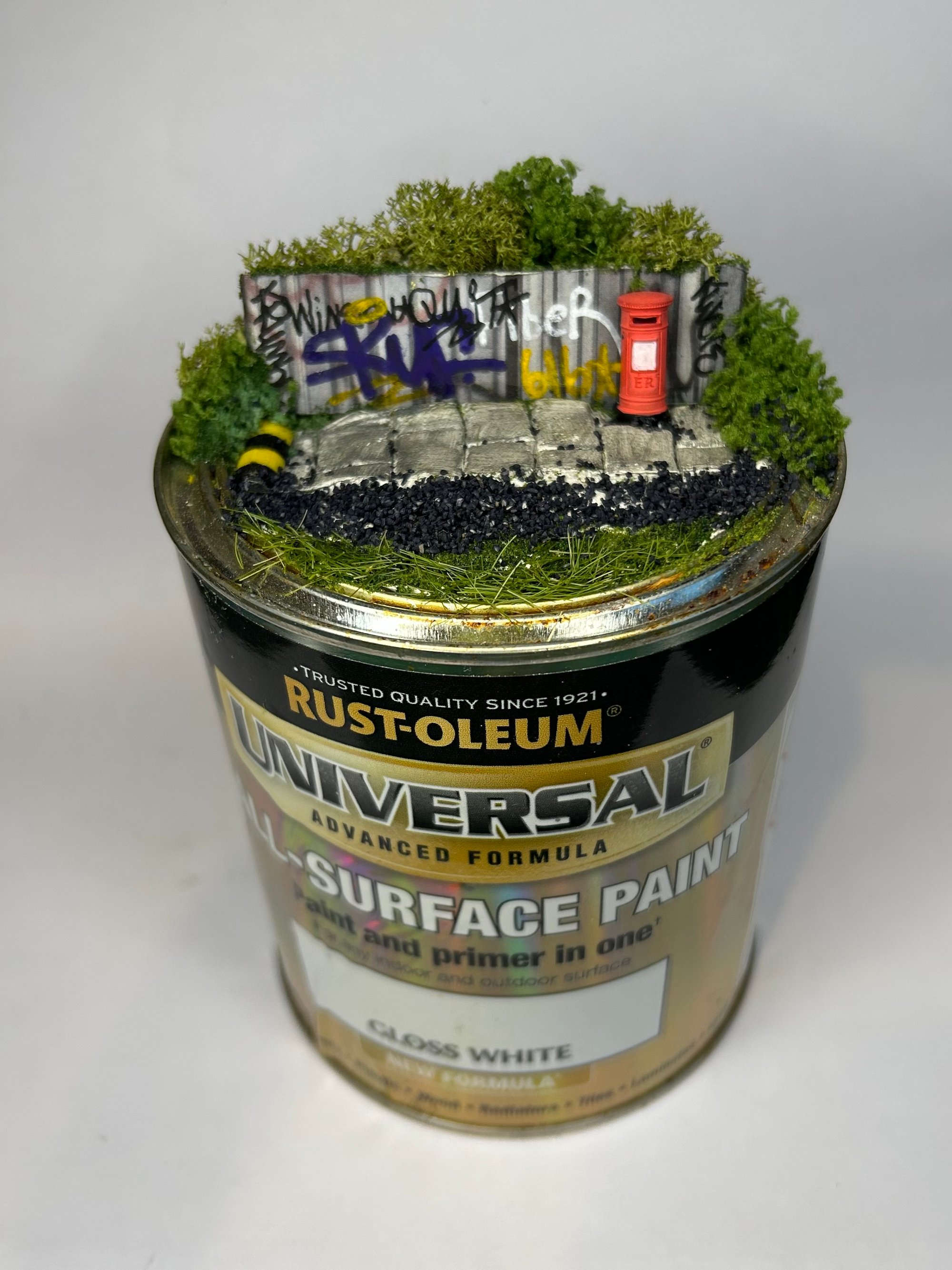 a 1l paint tin with pavement, wall graffiti and a bright red postbox.