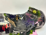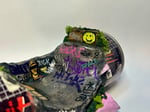 A curved bit of pink concrete that looks like it’s been skated and worn down over time.