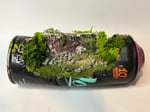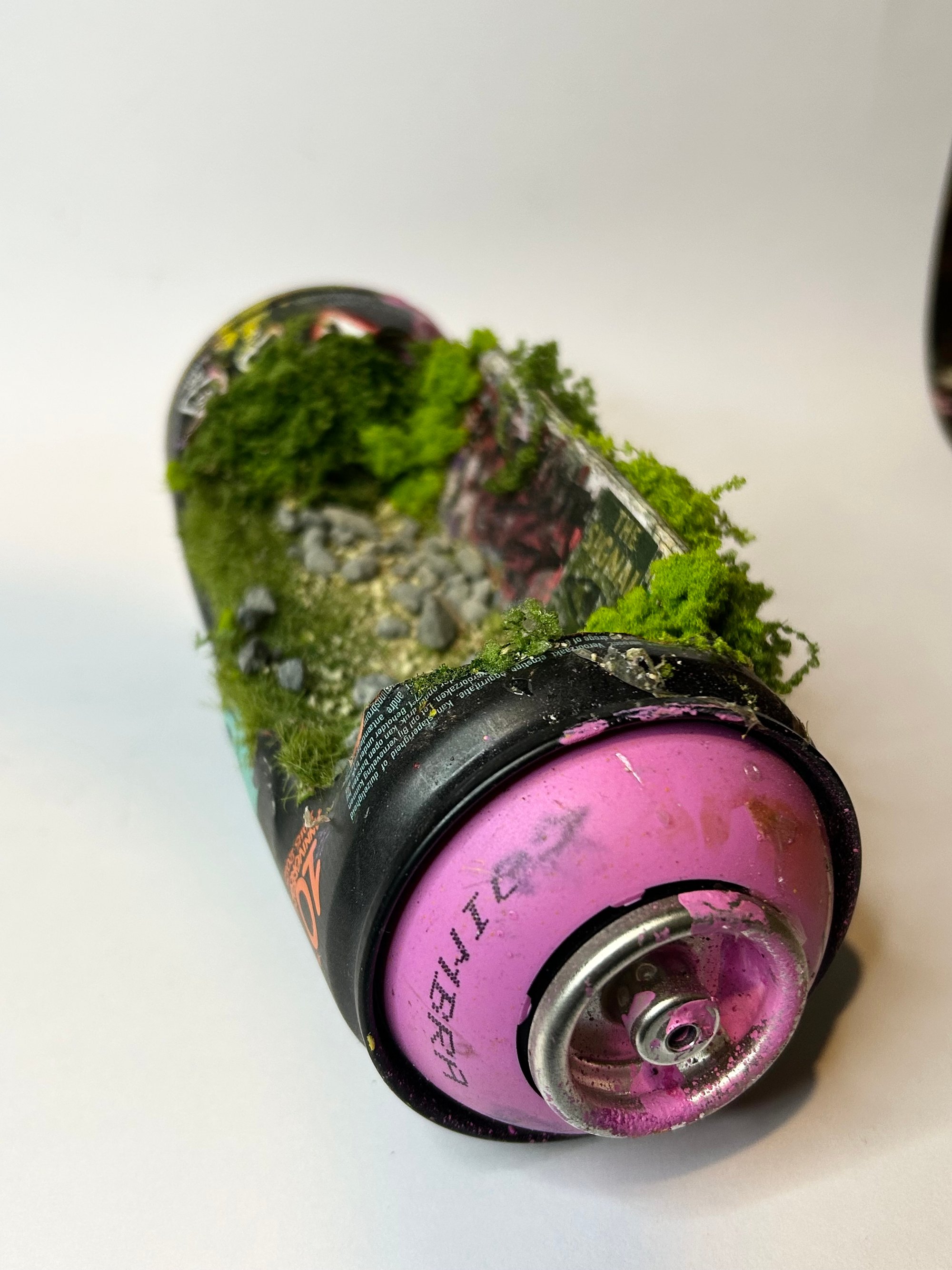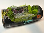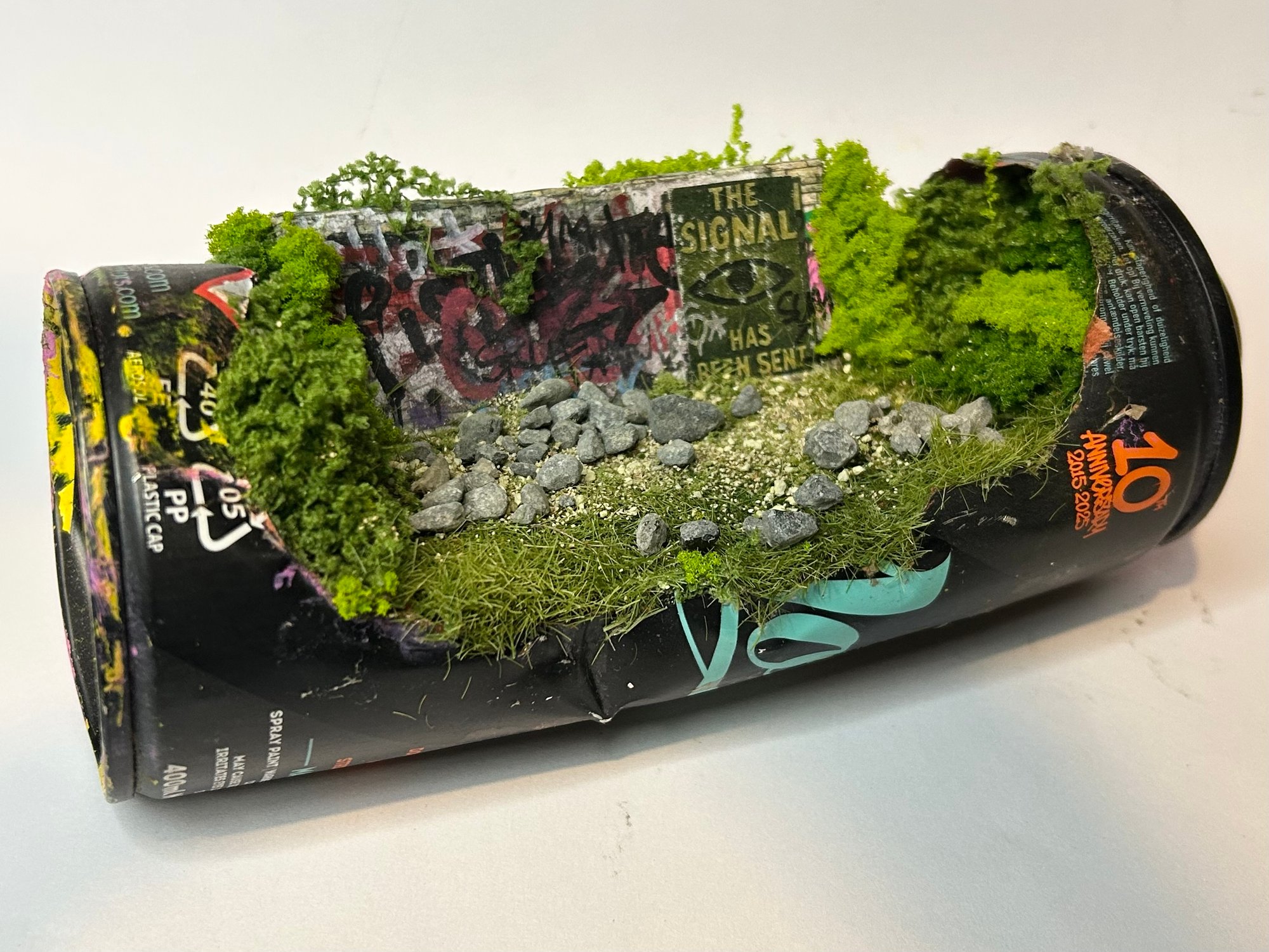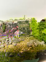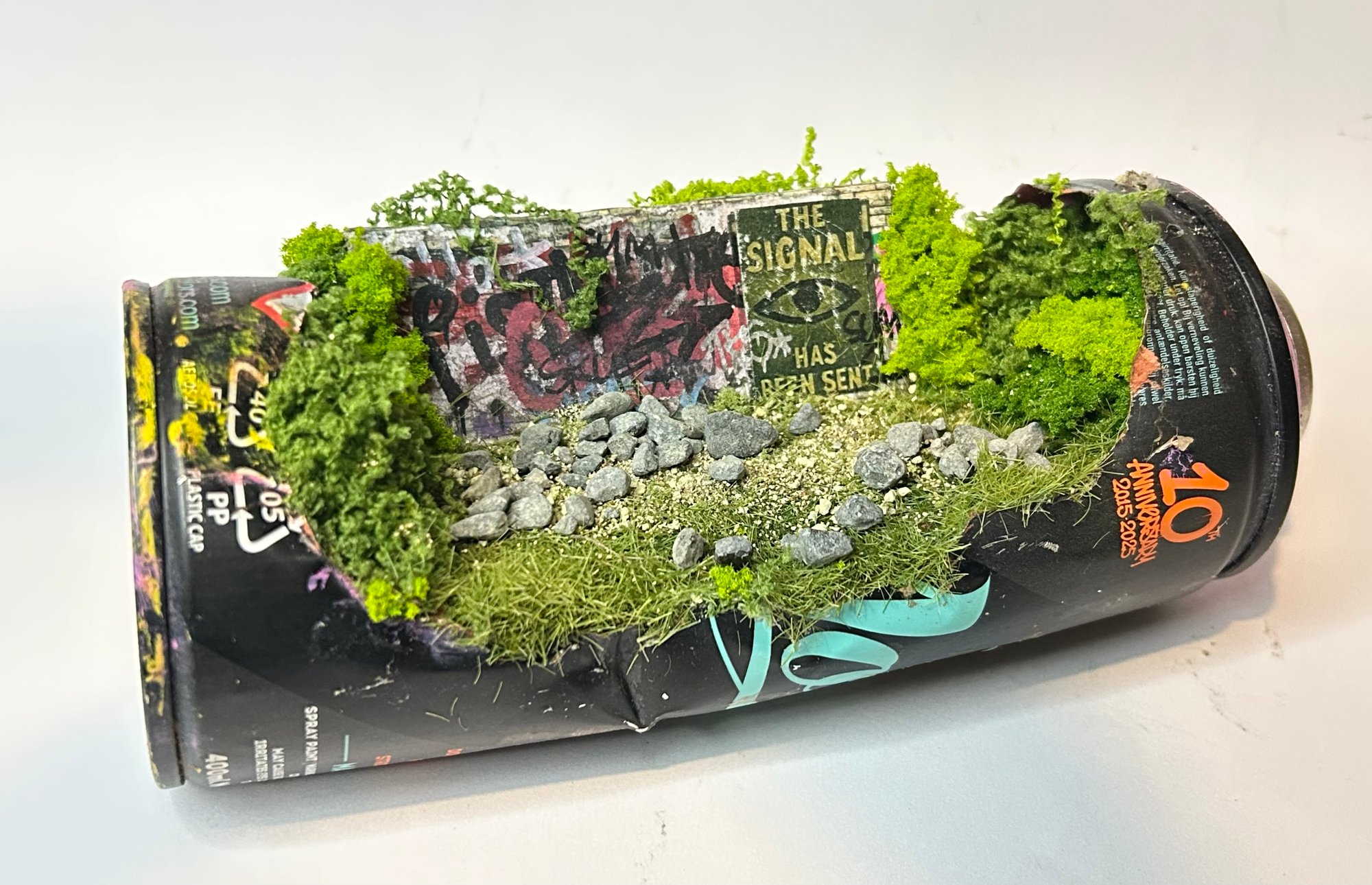 A mossy cut-through with a cracked wall layered in graffiti and a worn ‘Signal’ poster.